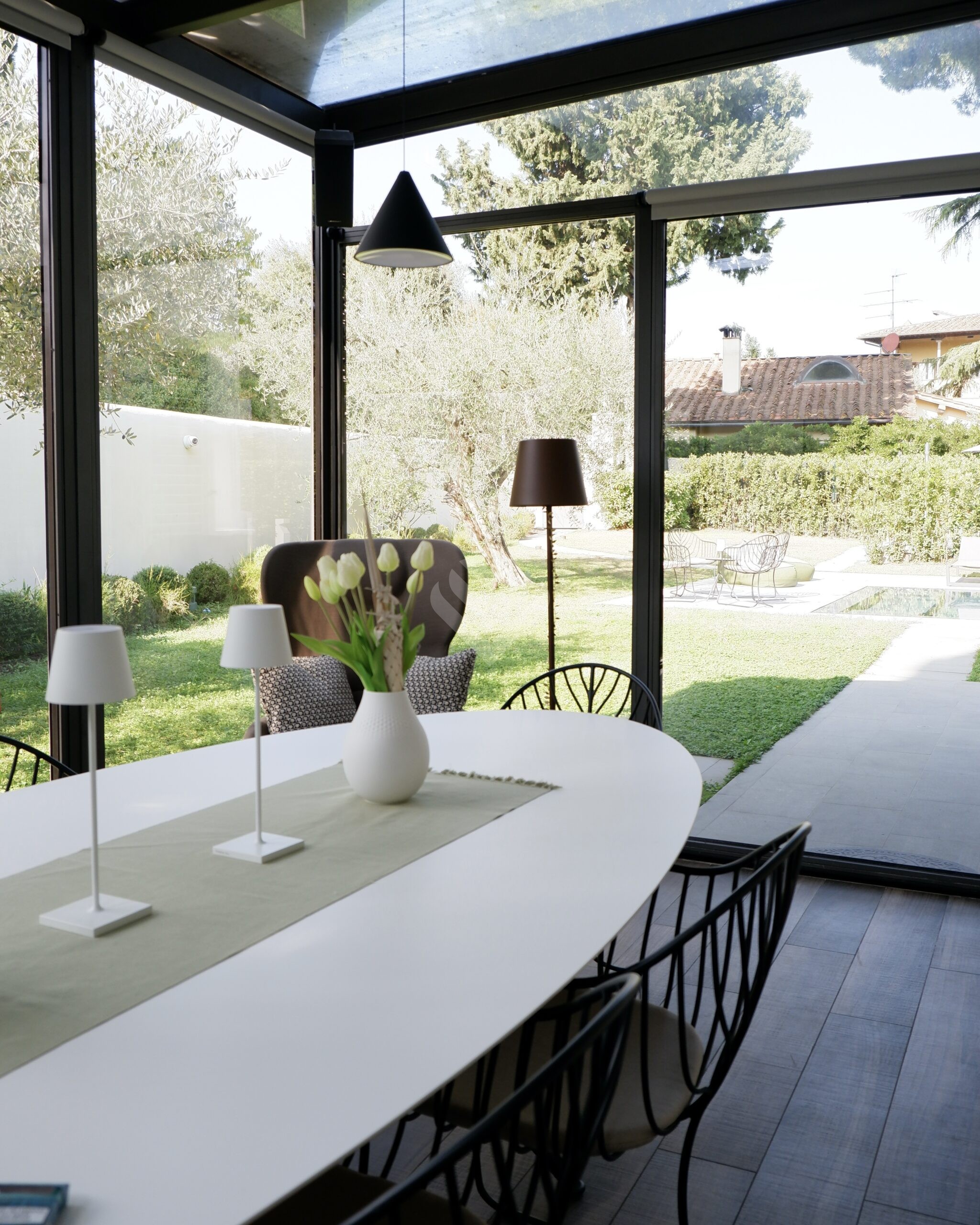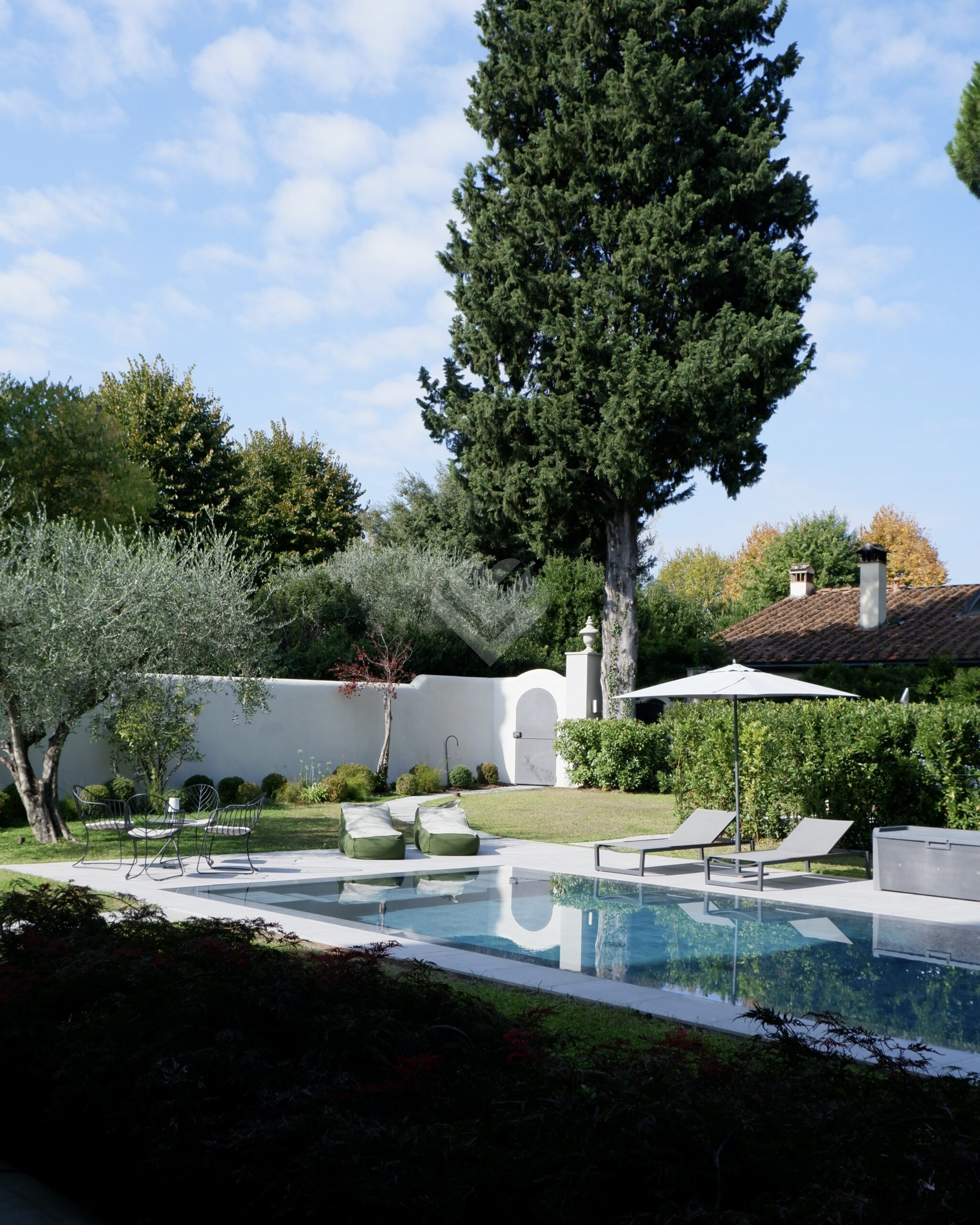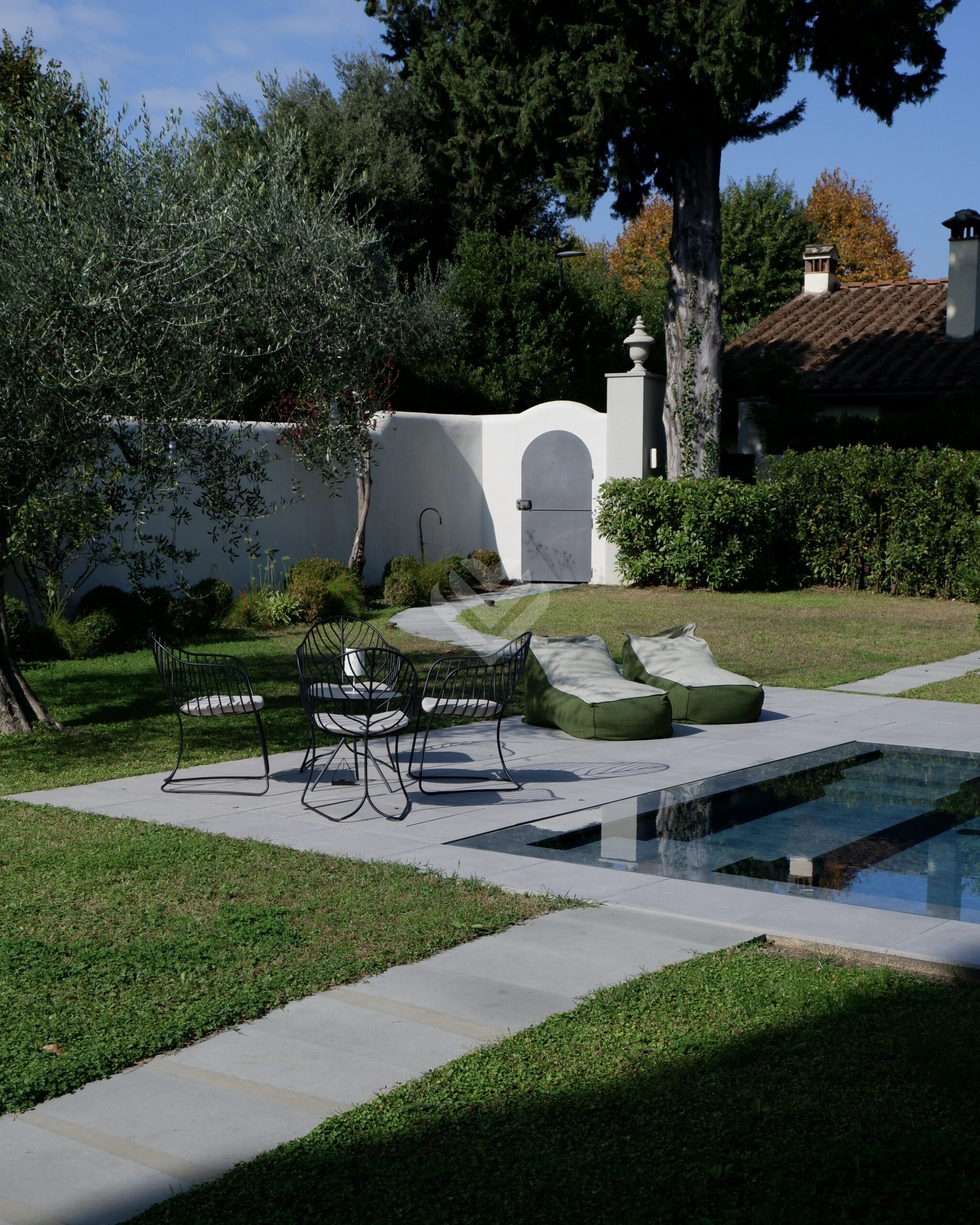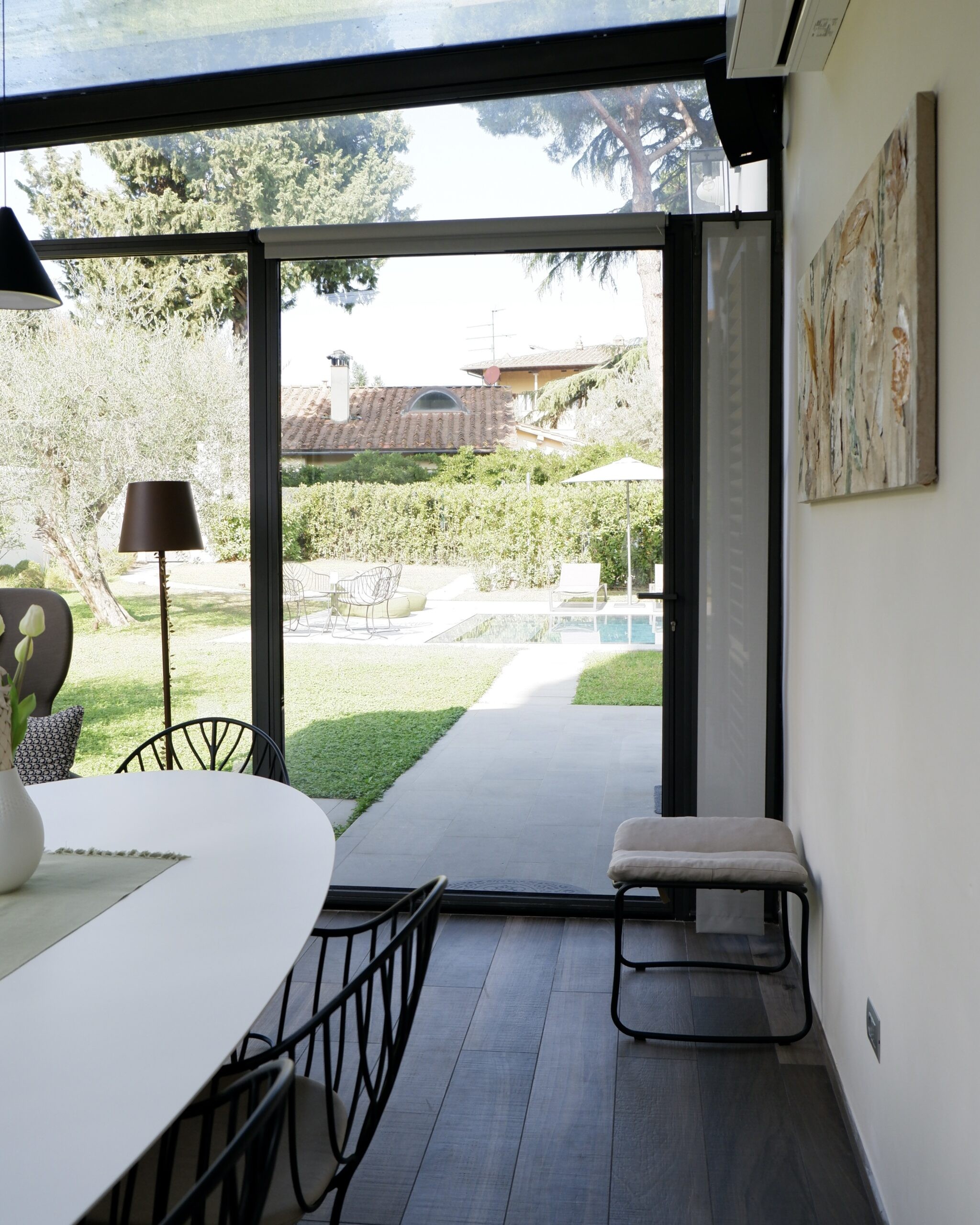 Al piano terra, l’ampio salone si apre verso il giardino attraverso grandi vetrate che creano una perfetta continuità tra interni ed esterni. Qui si trovano la piscina privata, finemente attrezzata, e una zona relax ideale per godere della bella stagione in totale privacy.