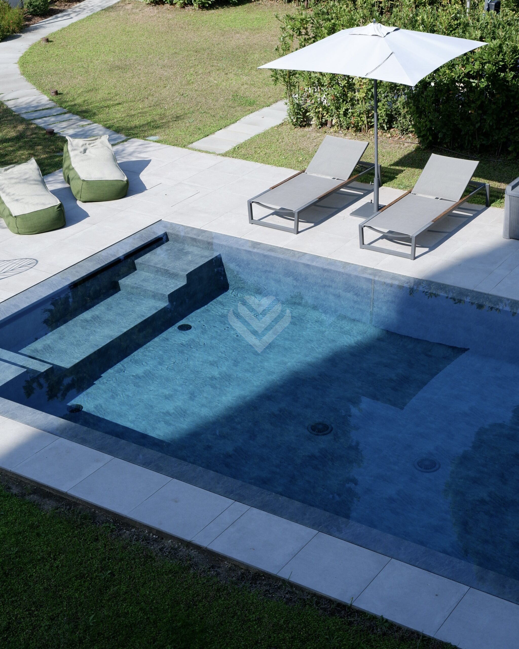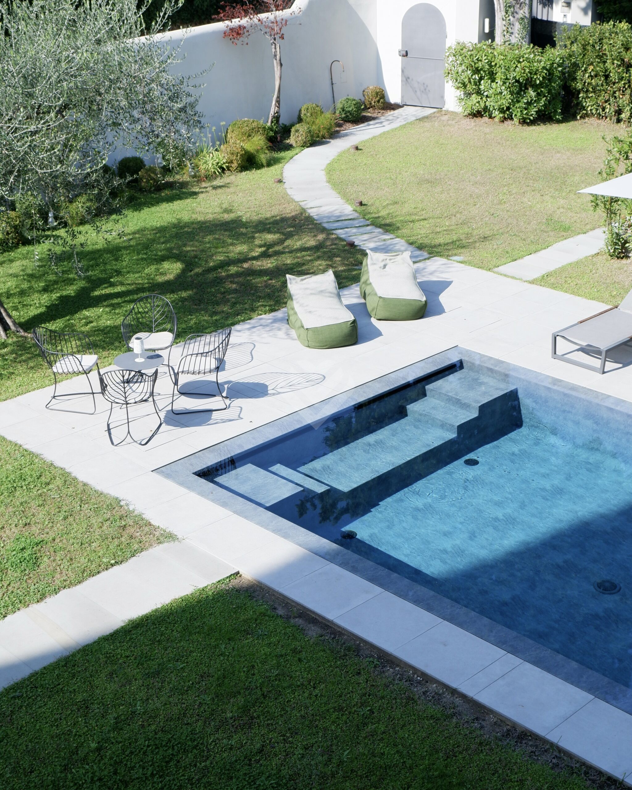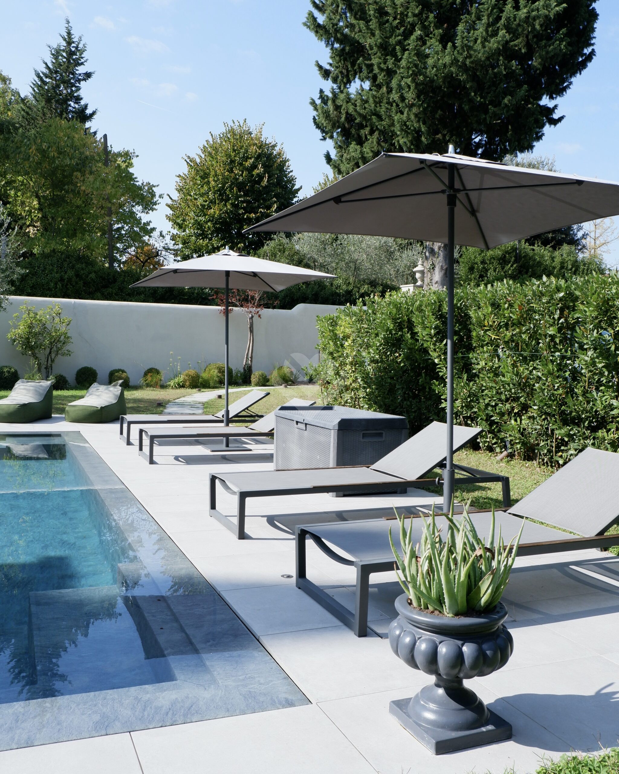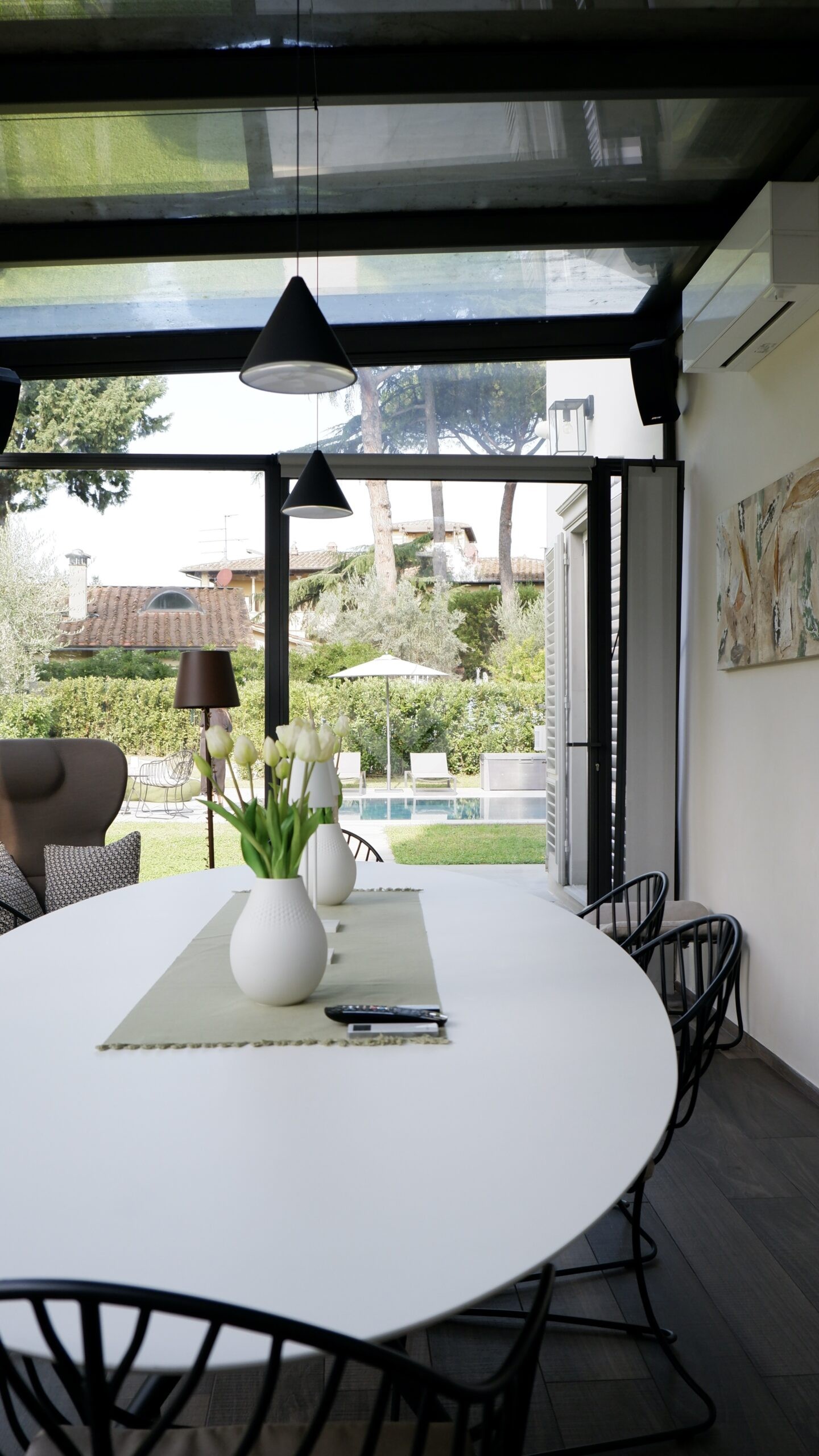 Al piano terra, l’ampio salone si apre verso il giardino attraverso grandi vetrate che creano una perfetta continuità tra interni ed esterni. Qui si trovano la piscina privata, finemente attrezzata, e una zona relax ideale per godere della bella stagione in totale privacy.
