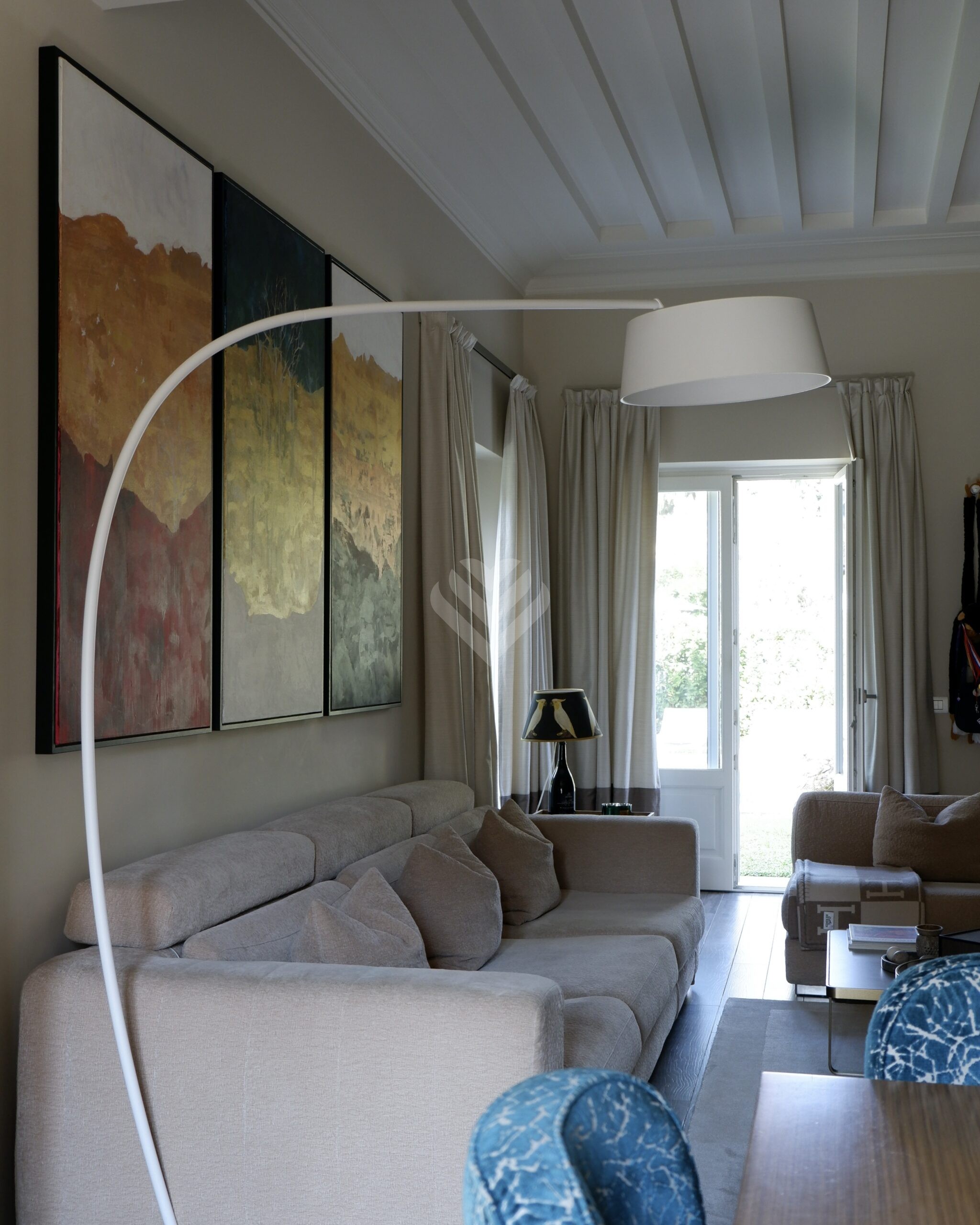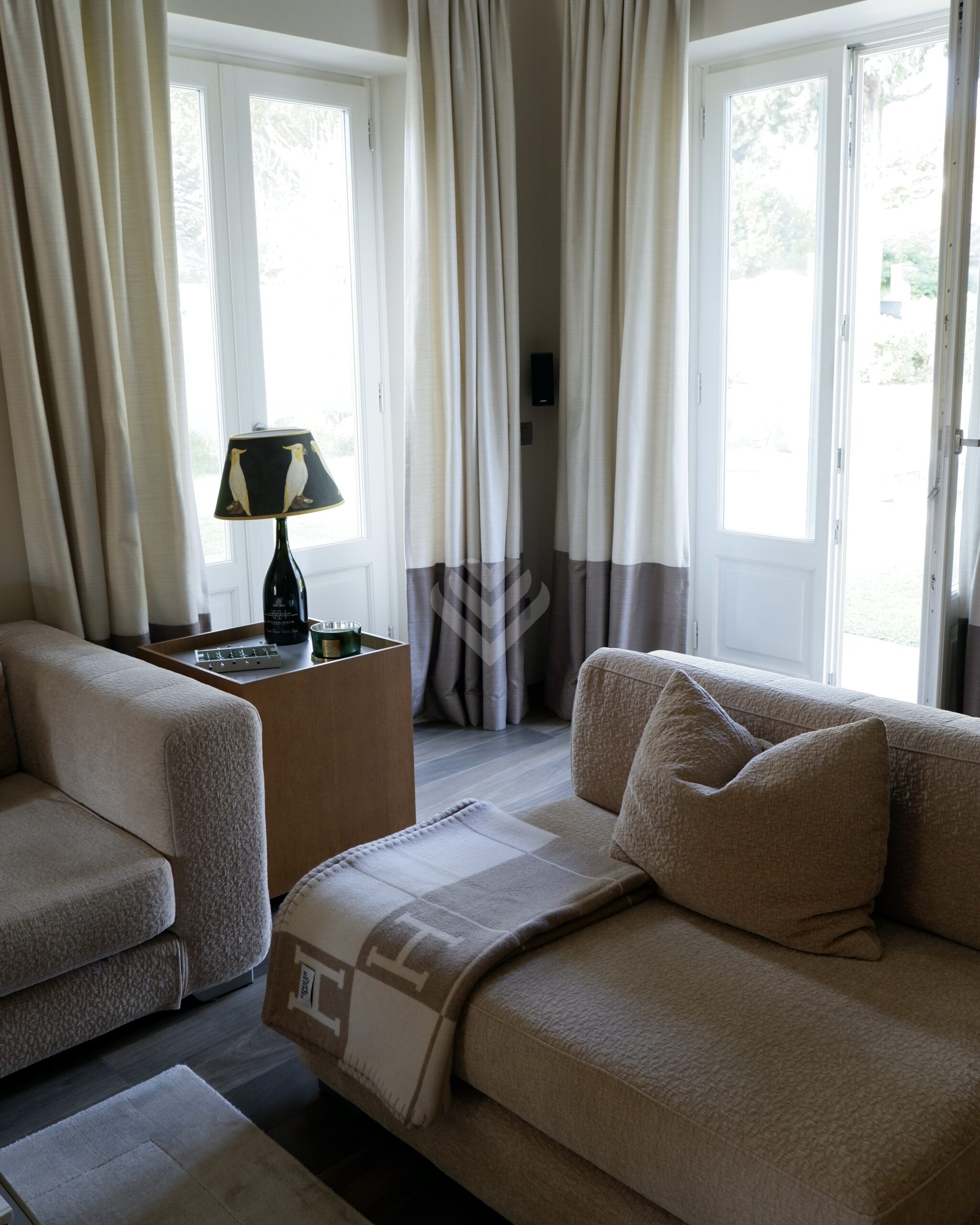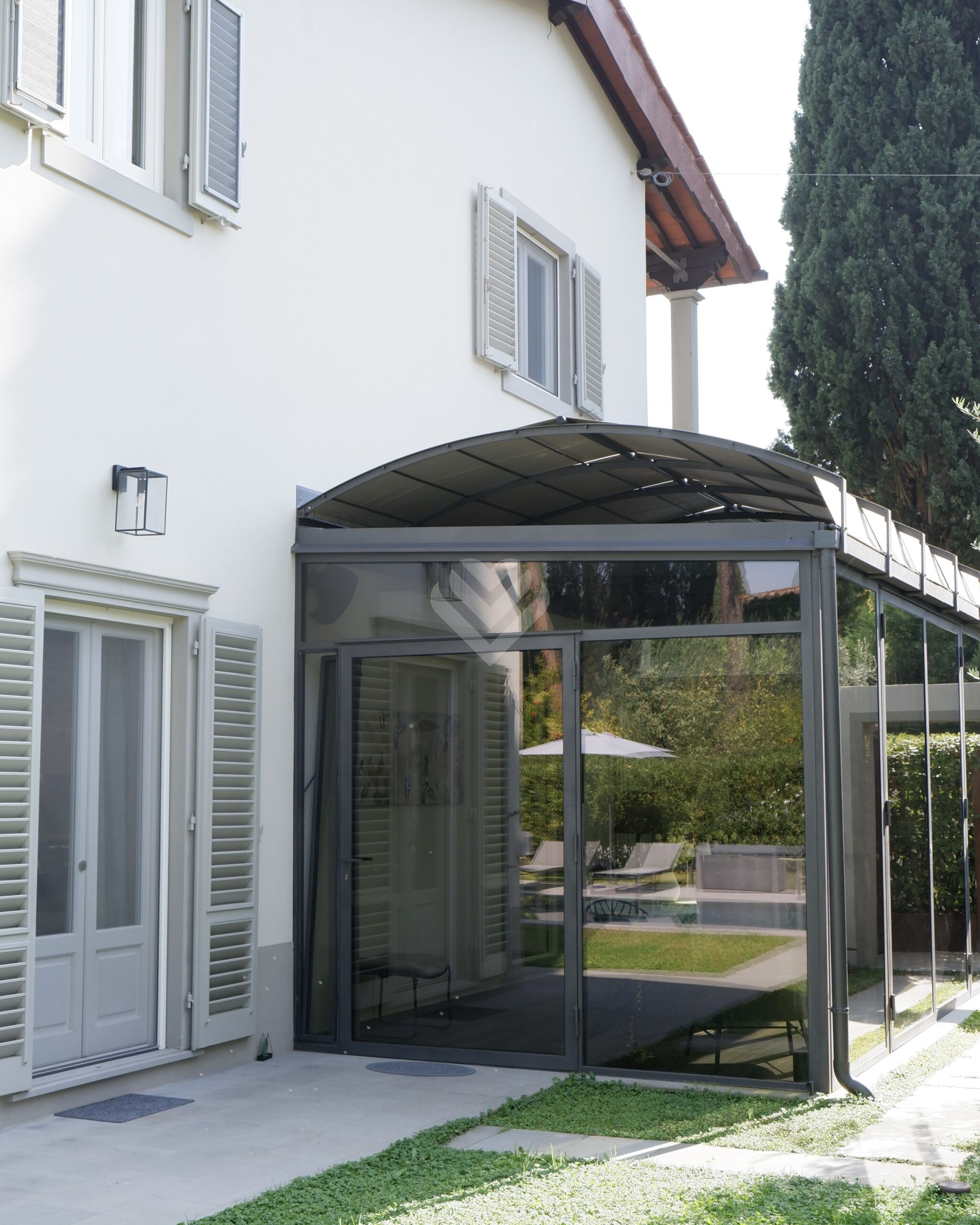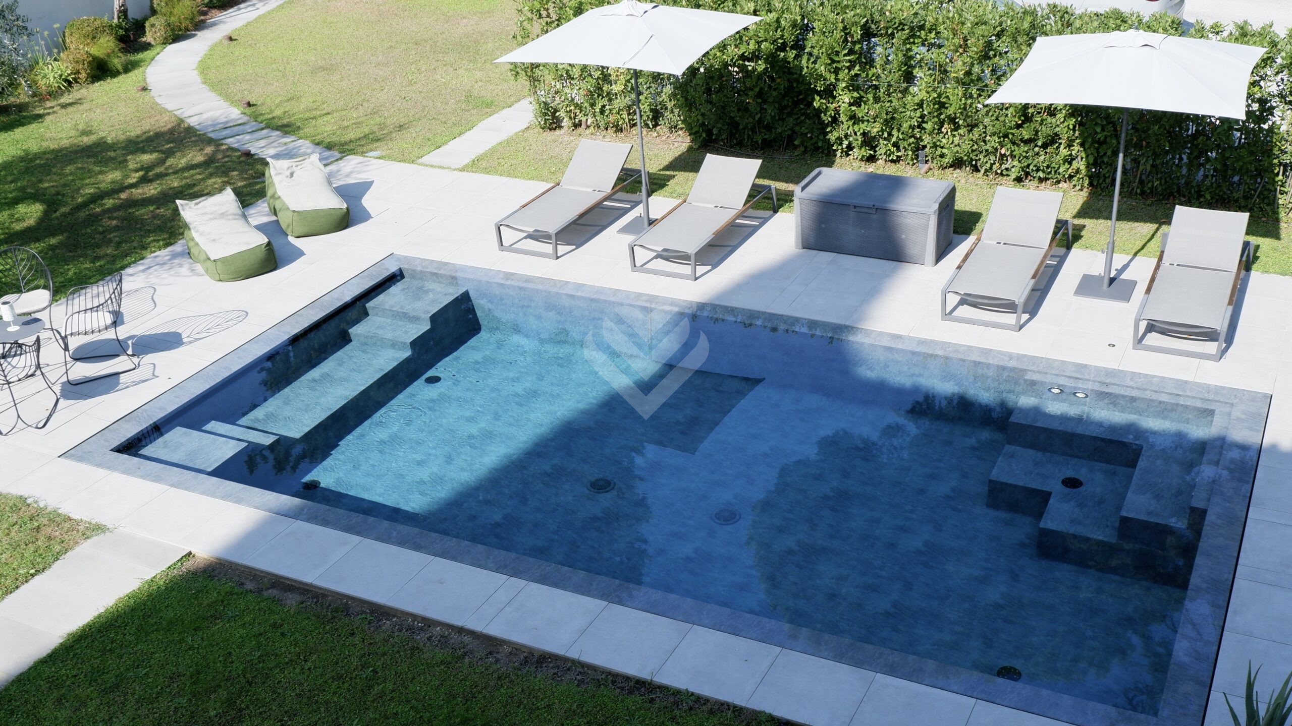 Al piano terra, l’ampio salone si apre verso il giardino attraverso grandi vetrate che creano una perfetta continuità tra interni ed esterni. Qui si trovano la piscina privata, finemente attrezzata, e una zona relax ideale per godere della bella stagione in totale privacy.