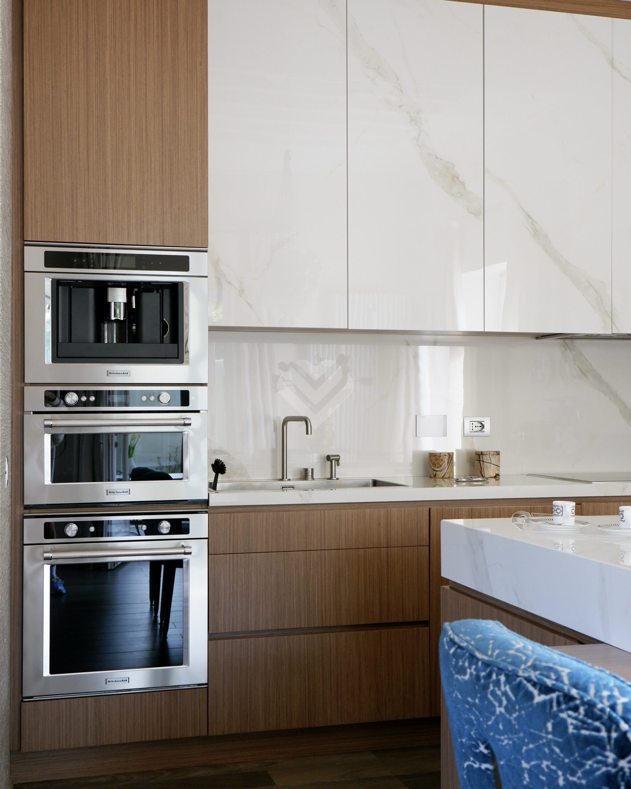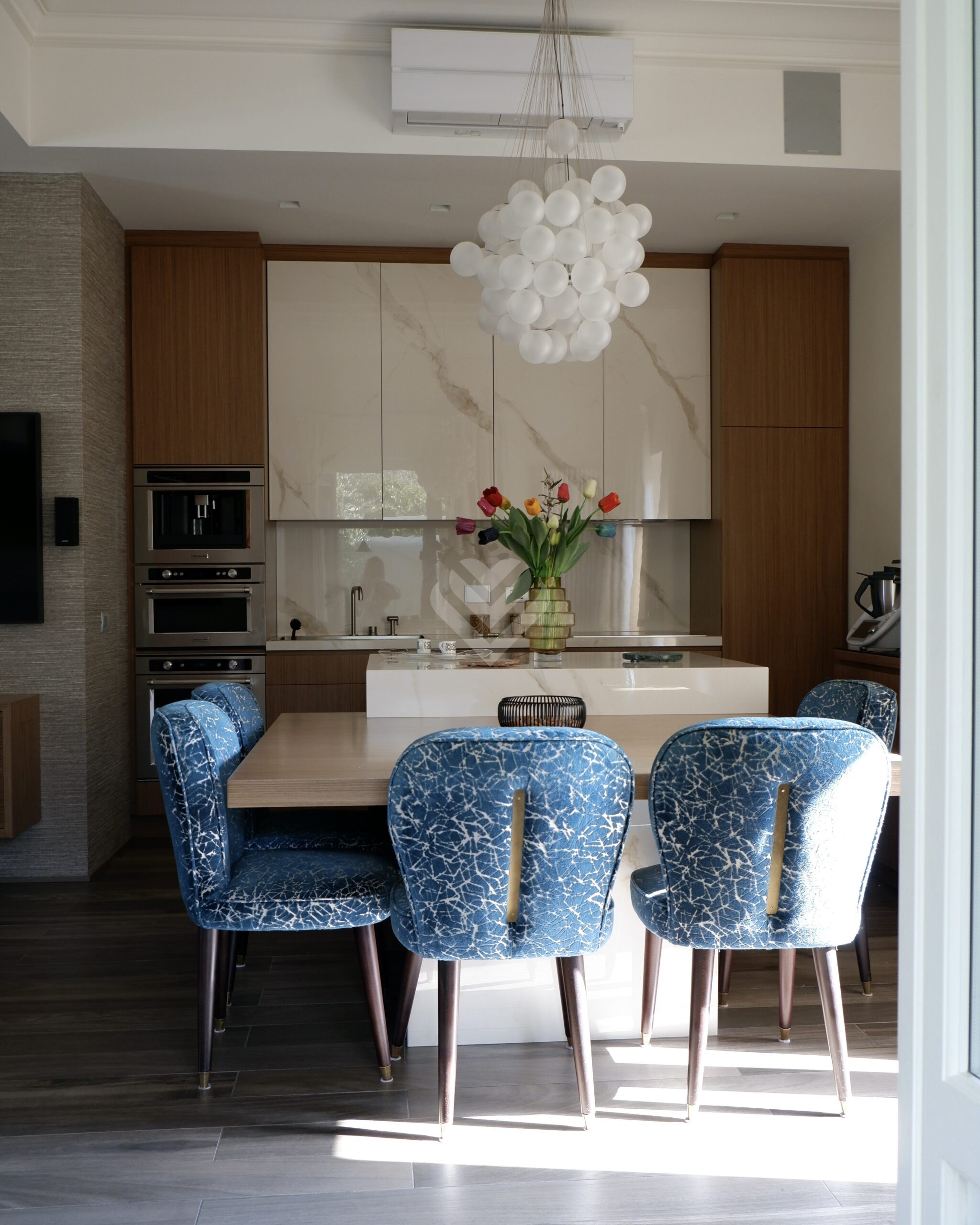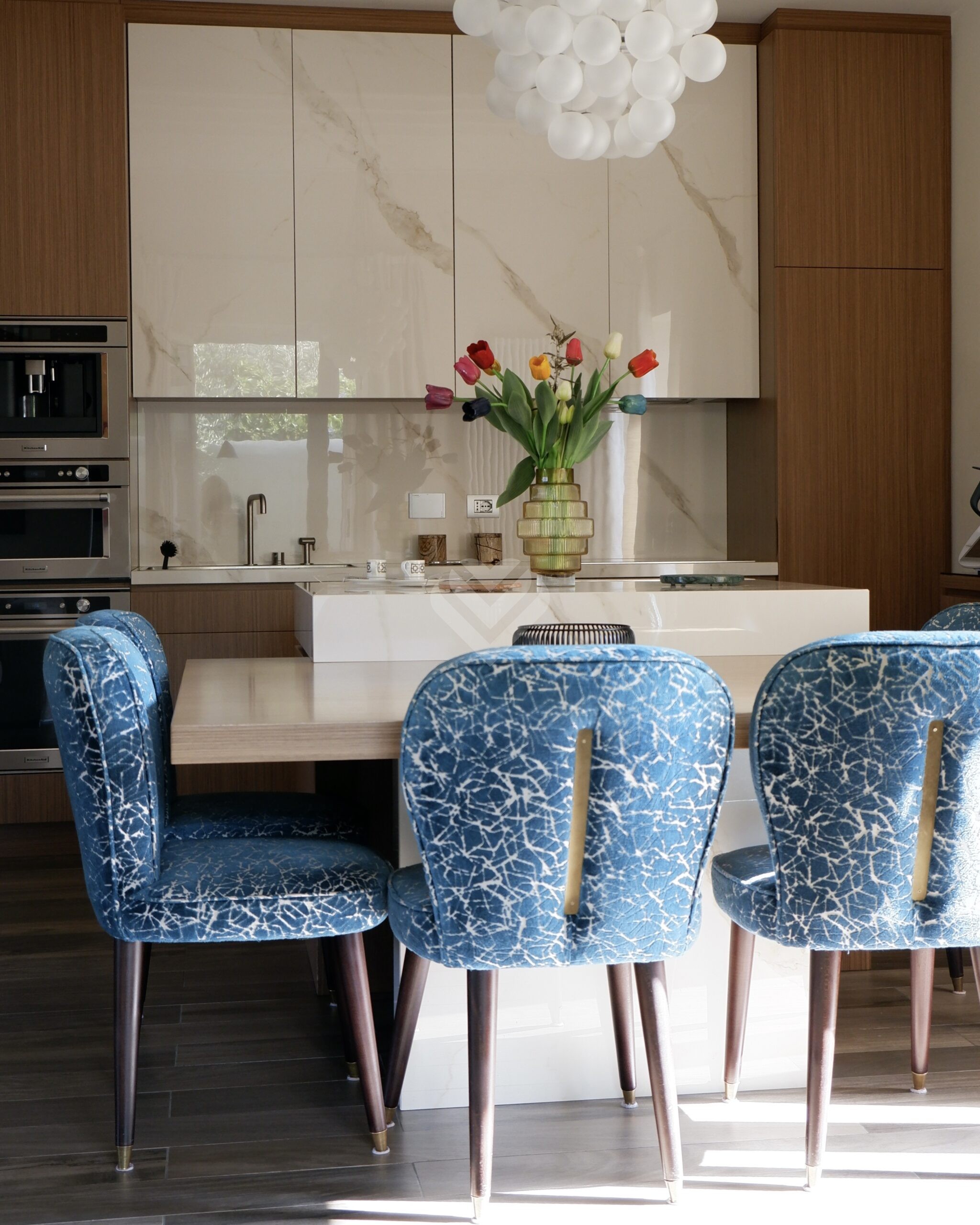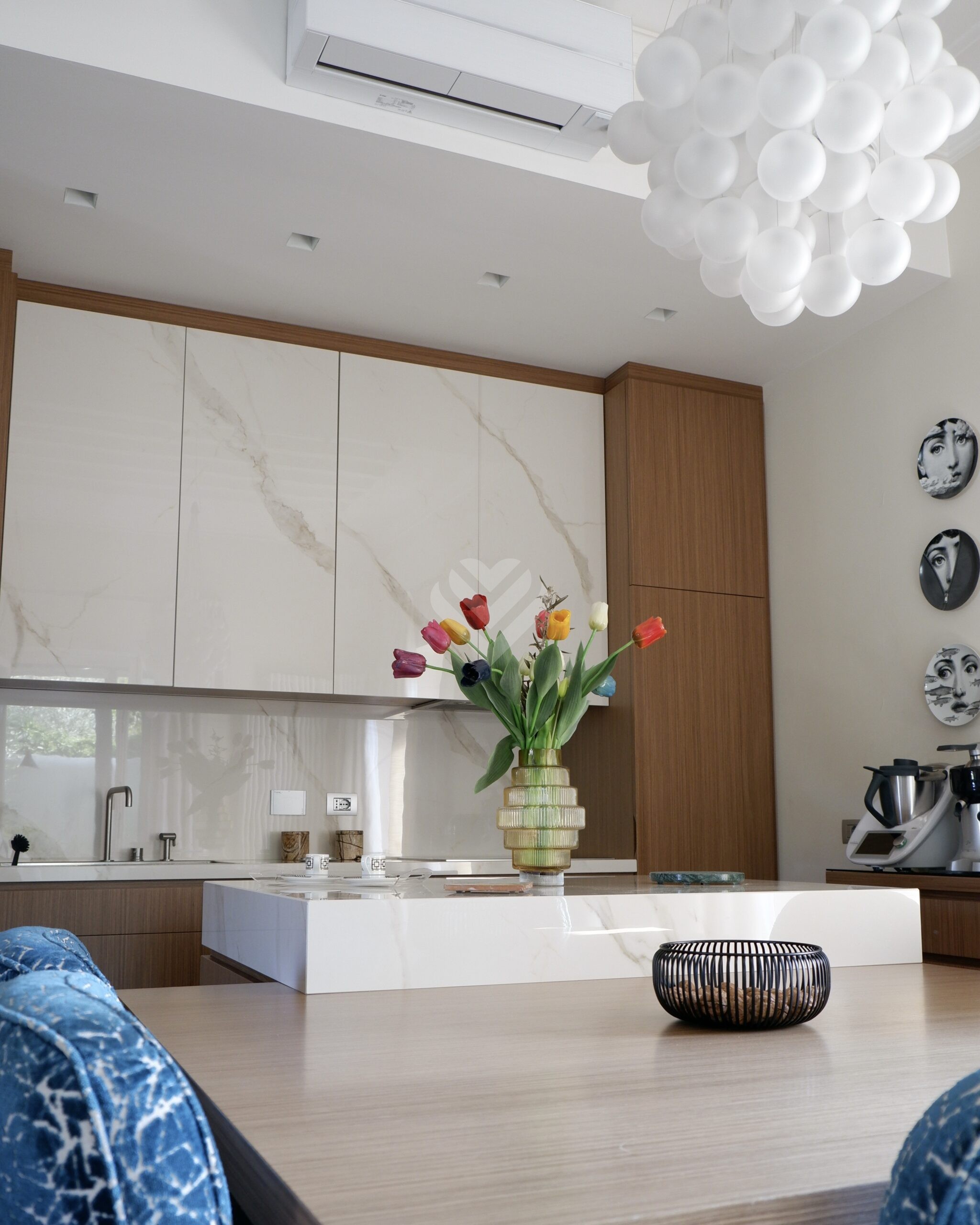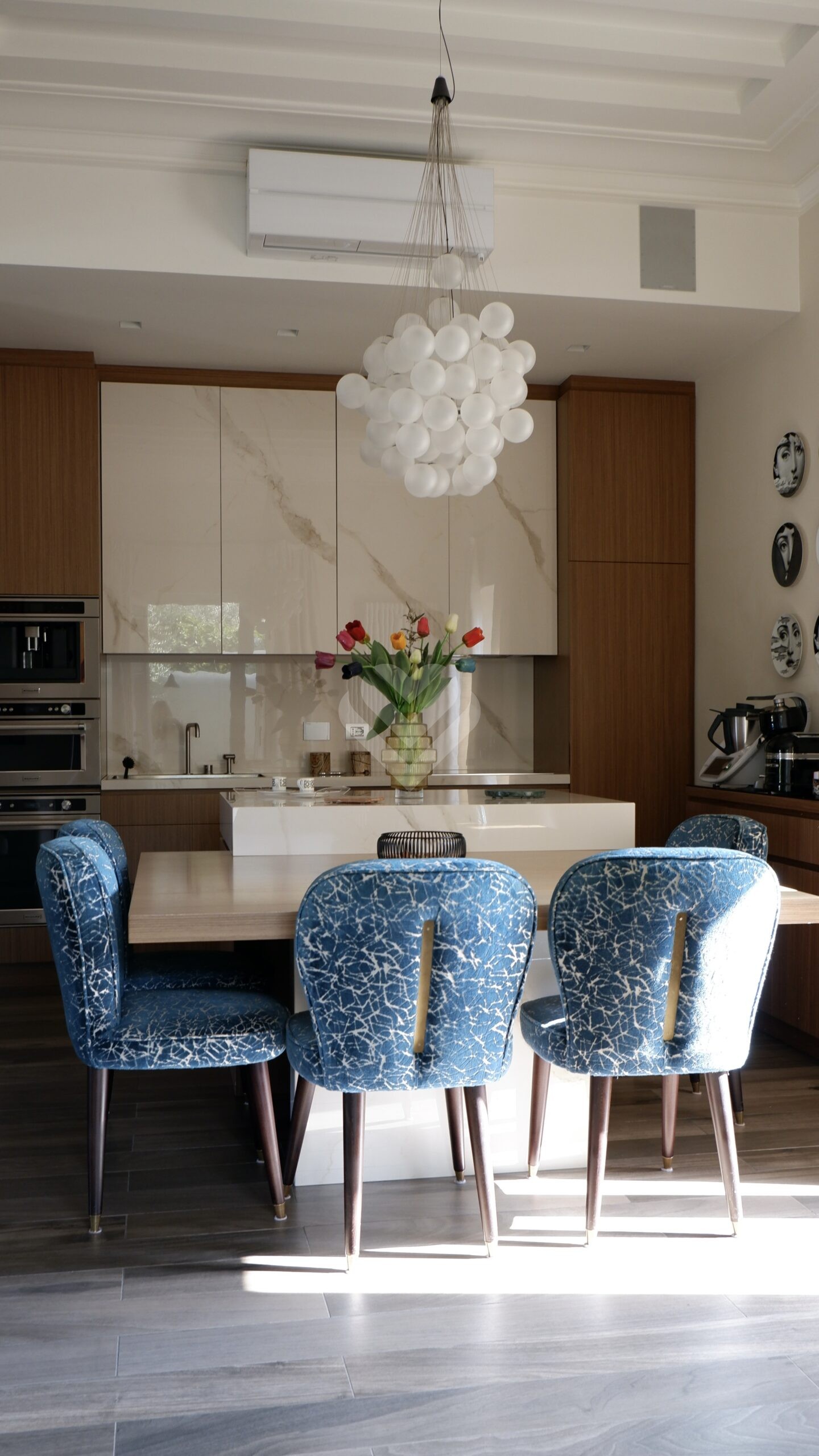 La cucina, dotata di un’isola centrale, è concepita come uno spazio conviviale e funzionale e si prolunga verso una veranda coperta e chiusa, perfetta per pranzi e cene in ogni momento dell’anno. Sullo stesso livello è presente anche un elegante bagno di servizio.