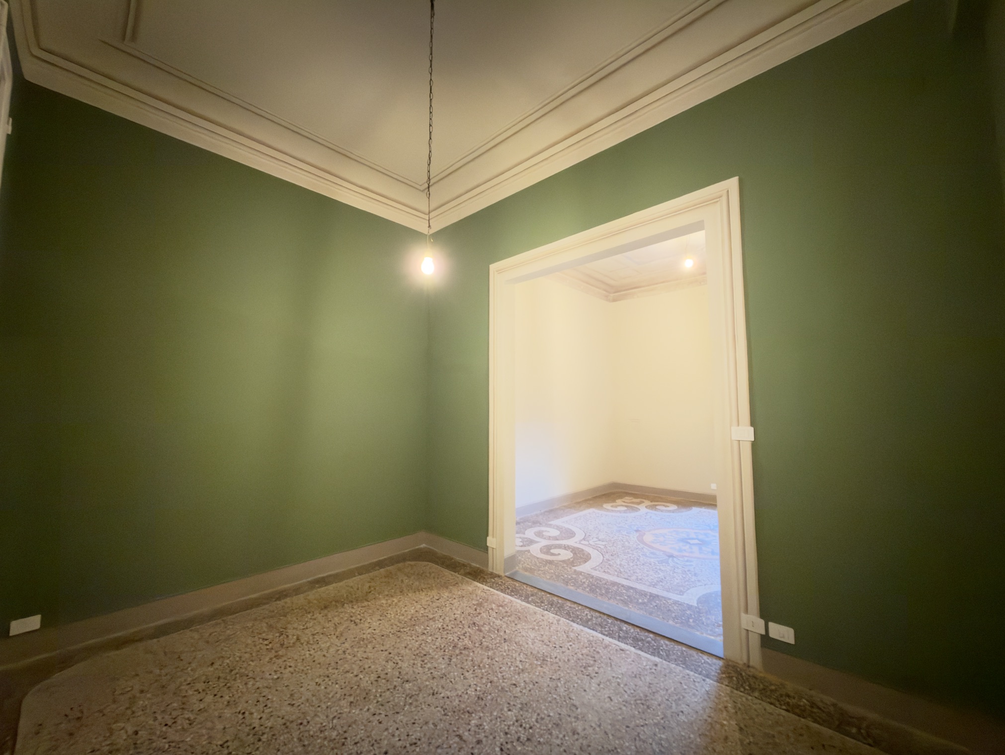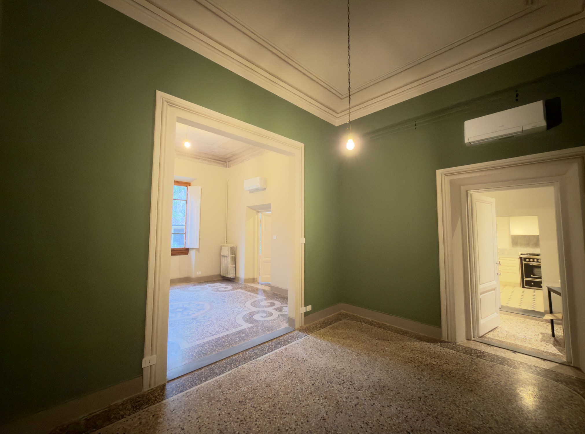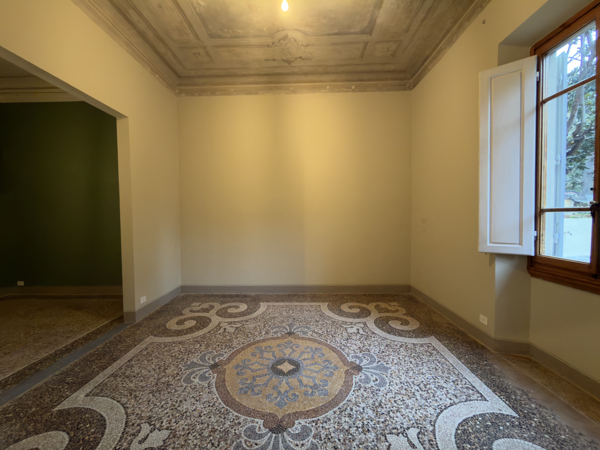 Proseguendo lungo il corridoio, servito da un primo bagno, si accede alla parte più suggestiva della proprietà: un salone doppio di alta rappresentanza, caratterizzato da meravigliosi affreschi originali e inondato di luce, con affaccio diretto sul giardino. Accanto al salone si sviluppa la quarta camera matrimoniale (padronale), dotata di bagno en suite e anch’essa con vista rilassante sul verde.