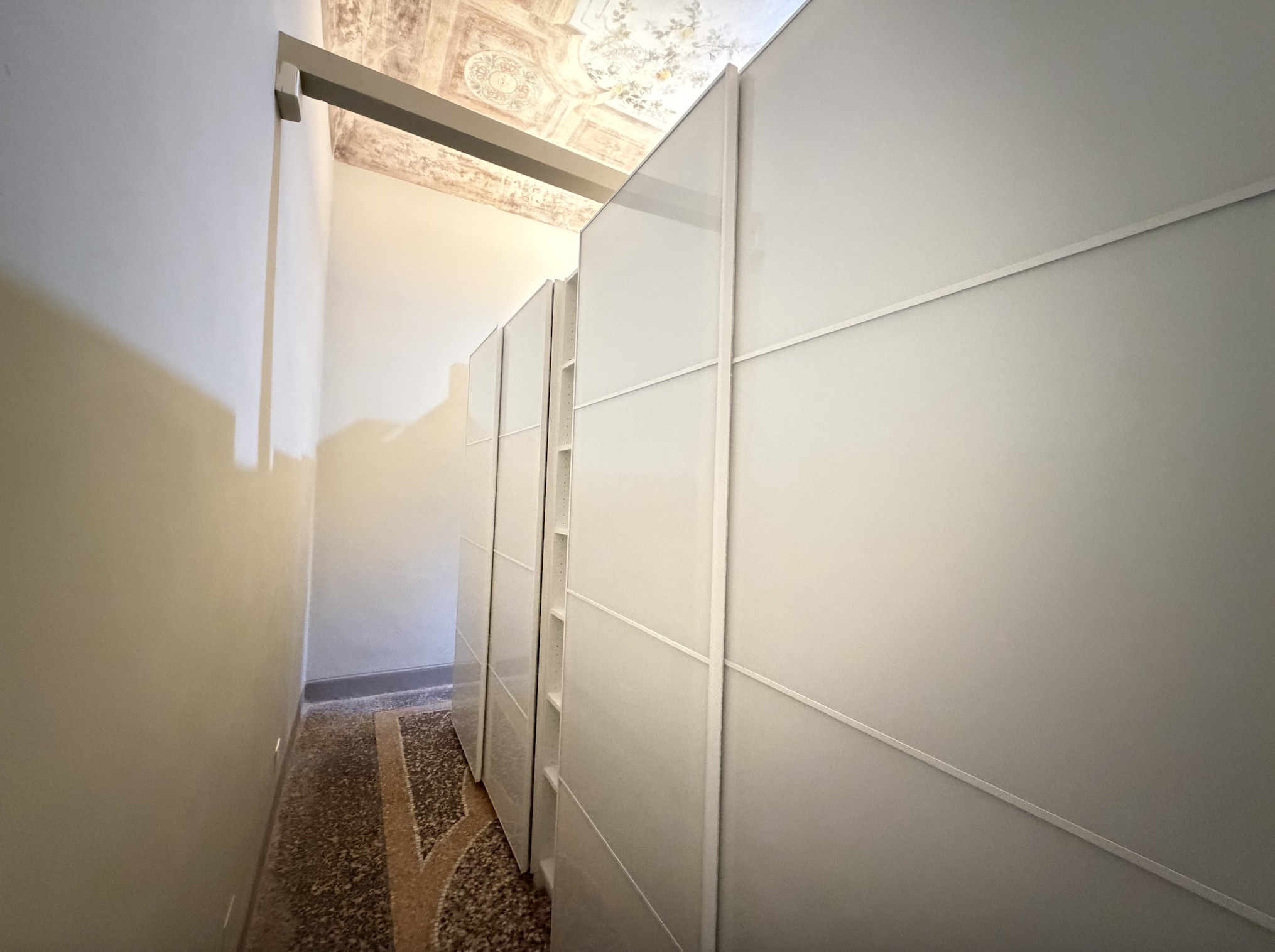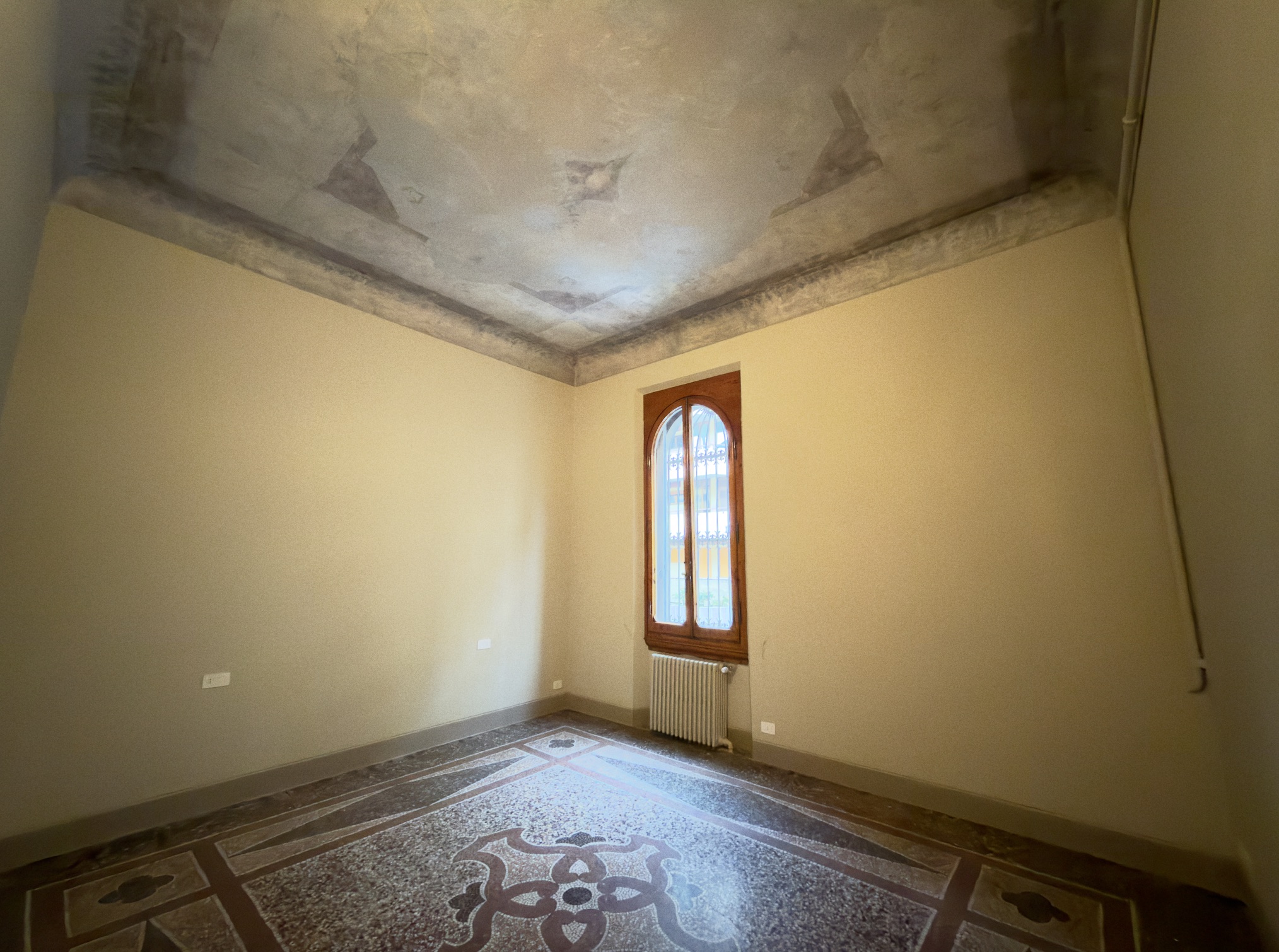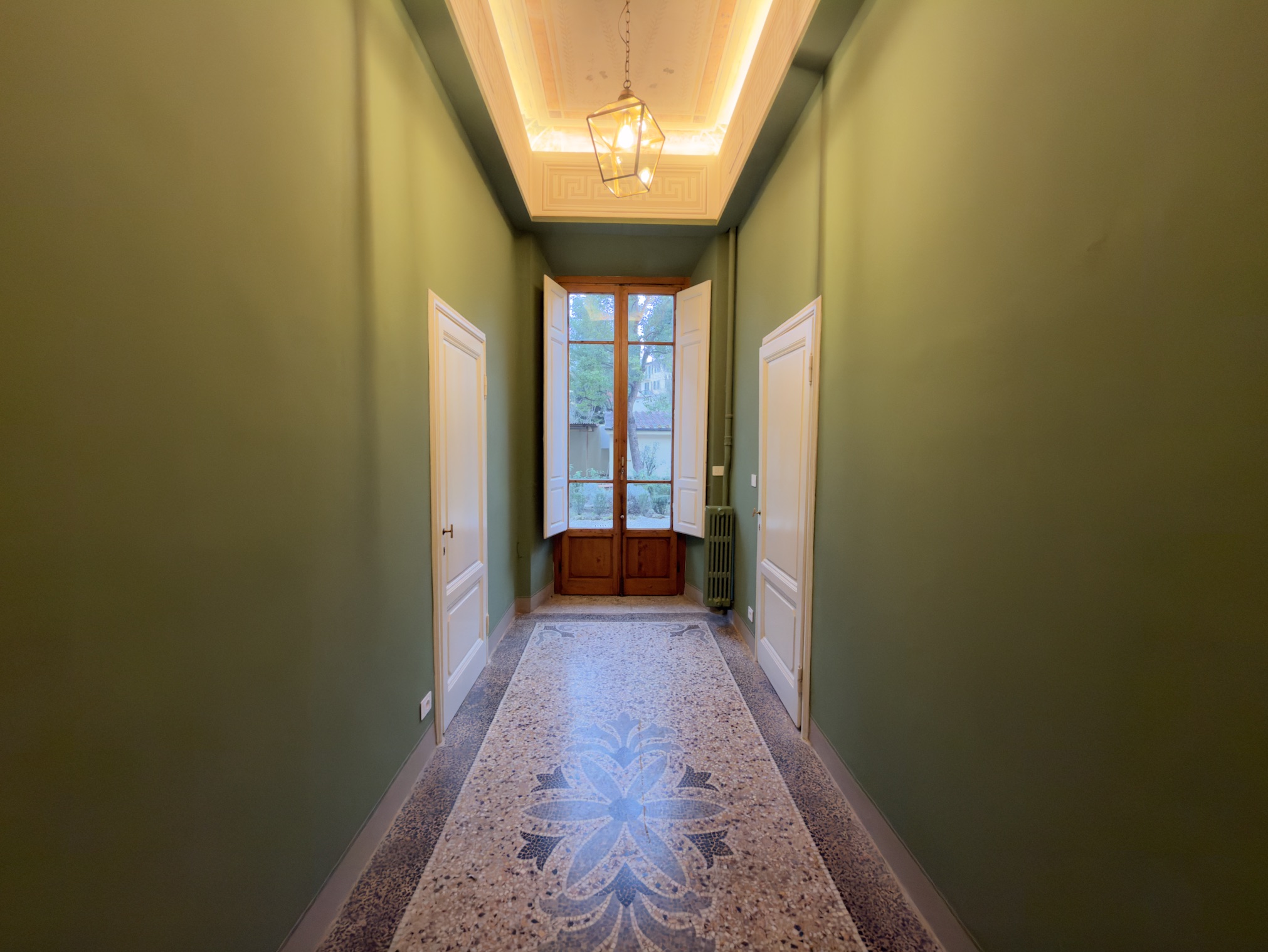 Proseguendo lungo il corridoio, servito da un primo bagno, si accede alla parte più suggestiva della proprietà: un salone doppio di alta rappresentanza, caratterizzato da meravigliosi affreschi originali e inondato di luce, con affaccio diretto sul giardino. Accanto al salone si sviluppa la quarta camera matrimoniale (padronale), dotata di bagno en suite e anch’essa con vista rilassante sul verde.