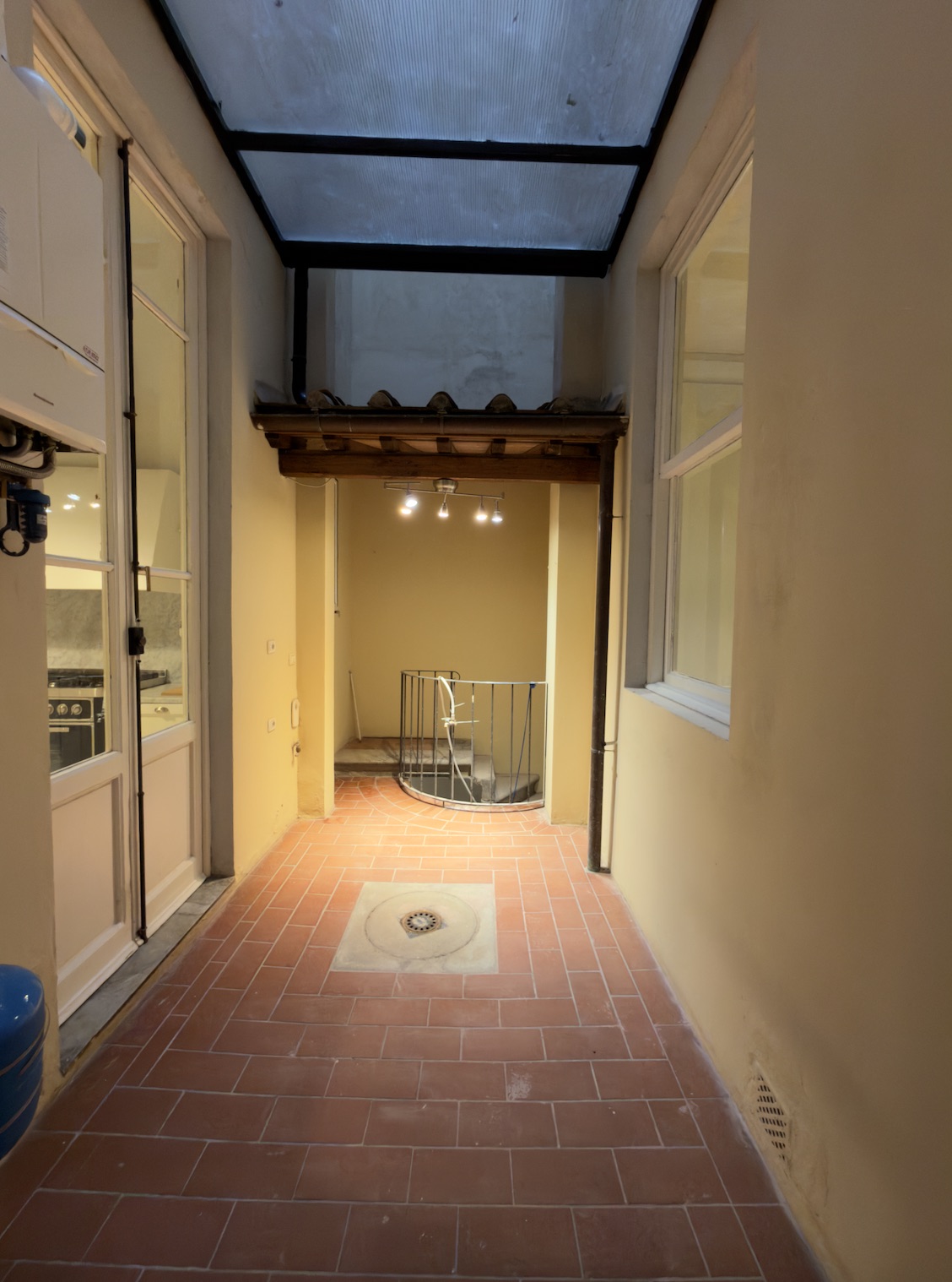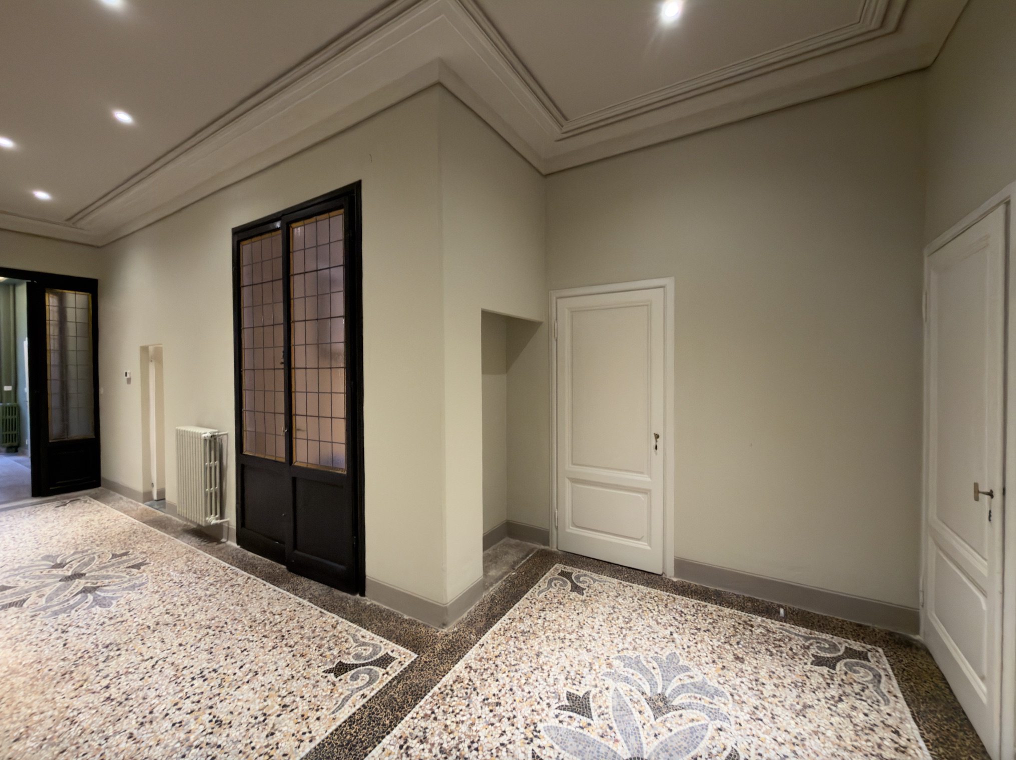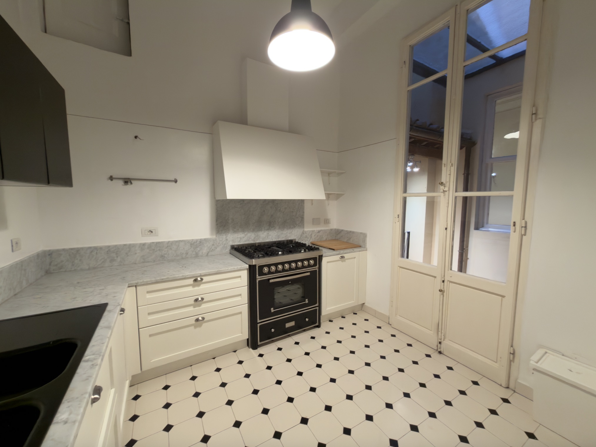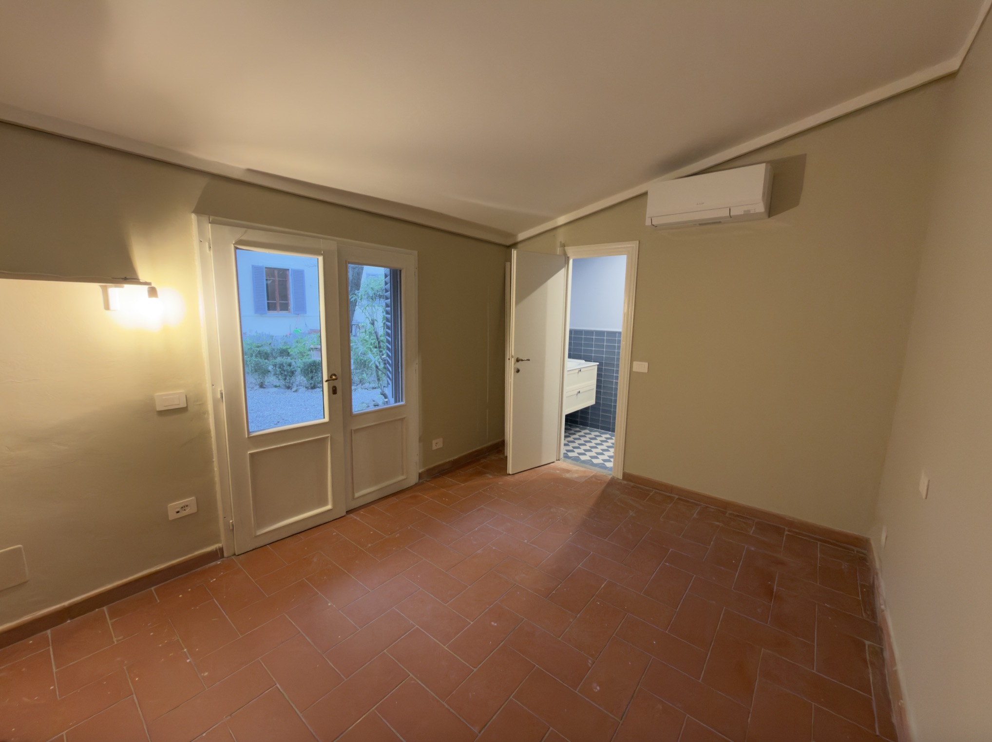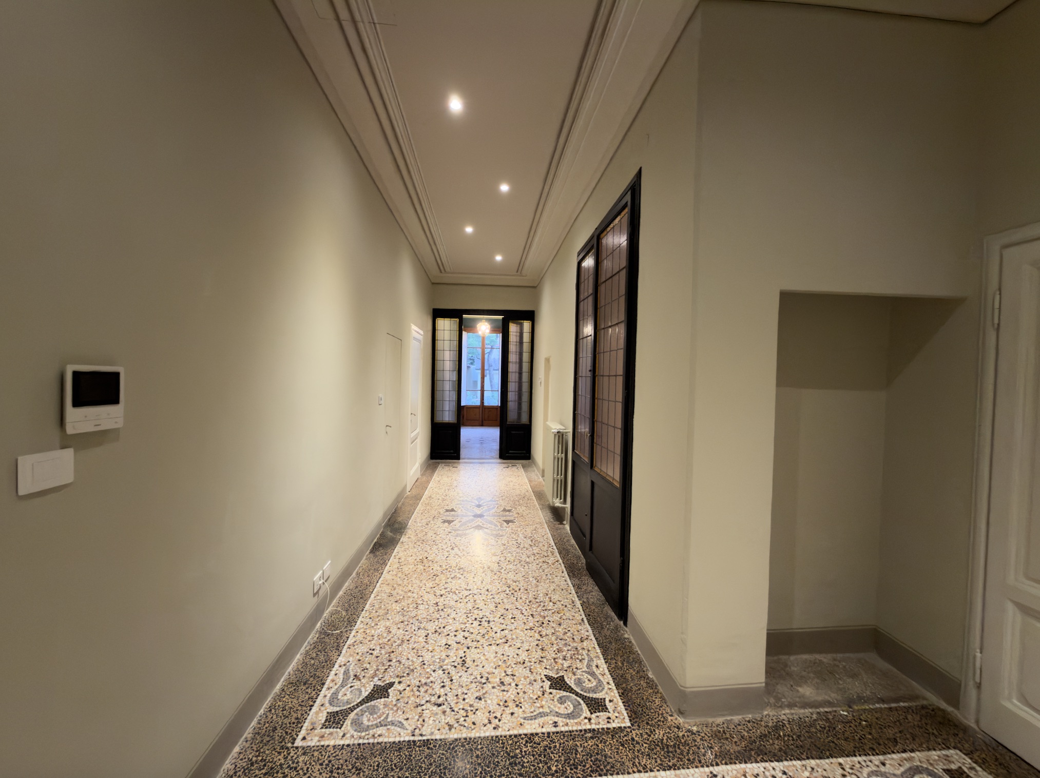 L’immobile si apre su un comodo ingresso che disimpegna razionalmente gli ambienti, introducendo subito all’atmosfera classica e raffinata della casa. La zona situata sulla destra ospita tre camere matrimoniali: due con affaccio sulla via principale e una, più riservata, che guarda su una deliziosa corte privata interna. Adiacente a quest’ultima troviamo la cucina abitabile con accesso diretto alla corte, perfetta come sfogo esterno di servizio o per colazioni all’aperto.