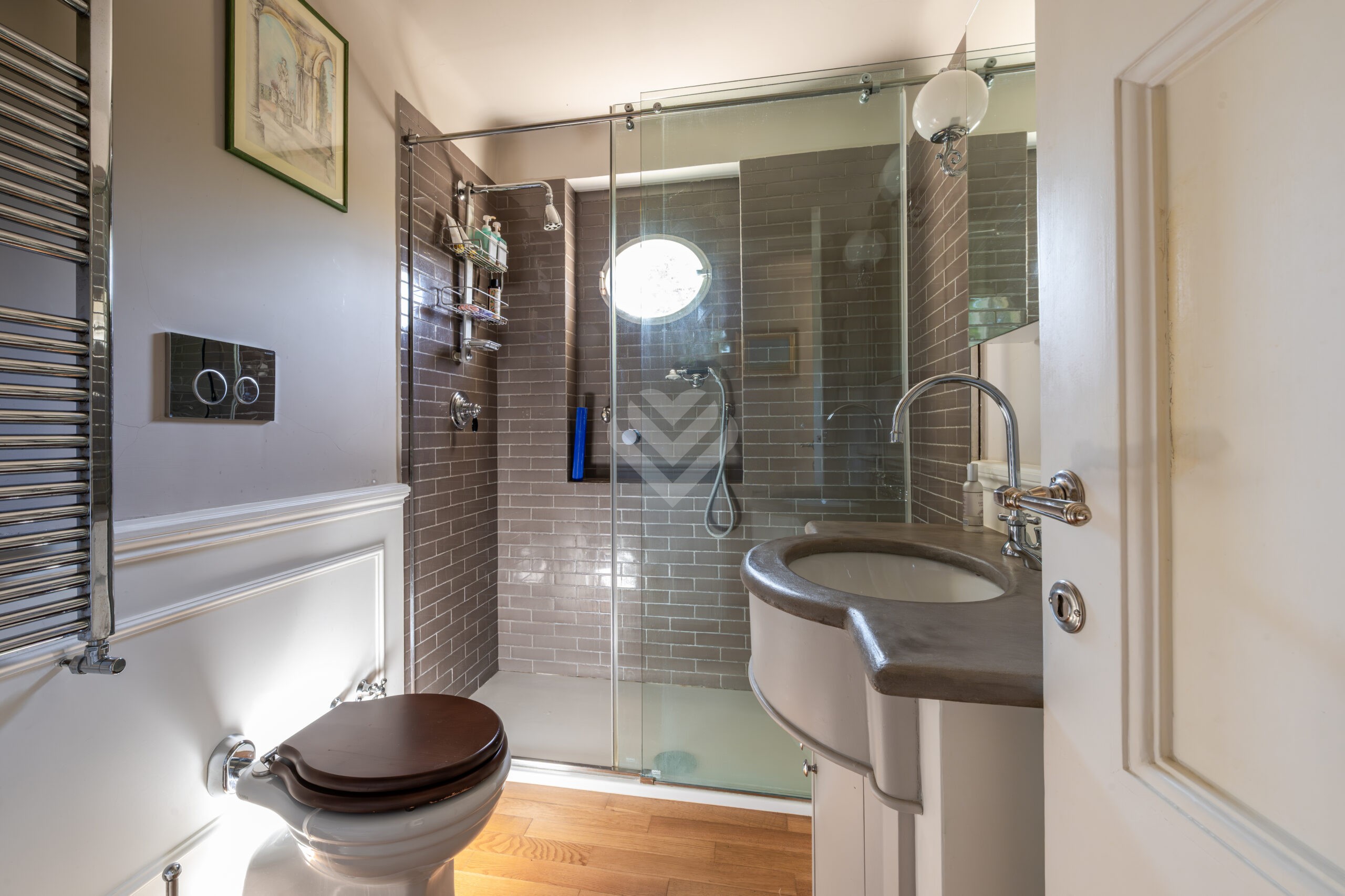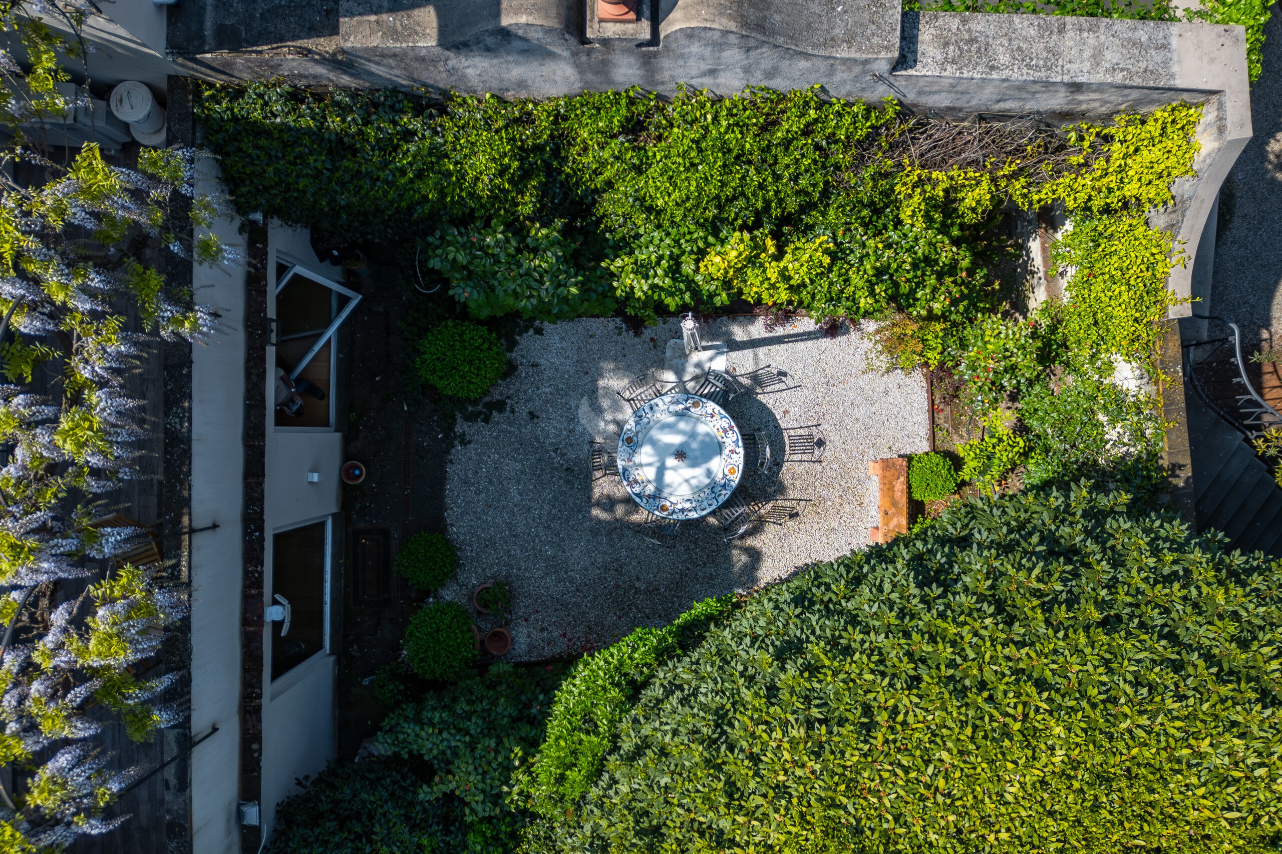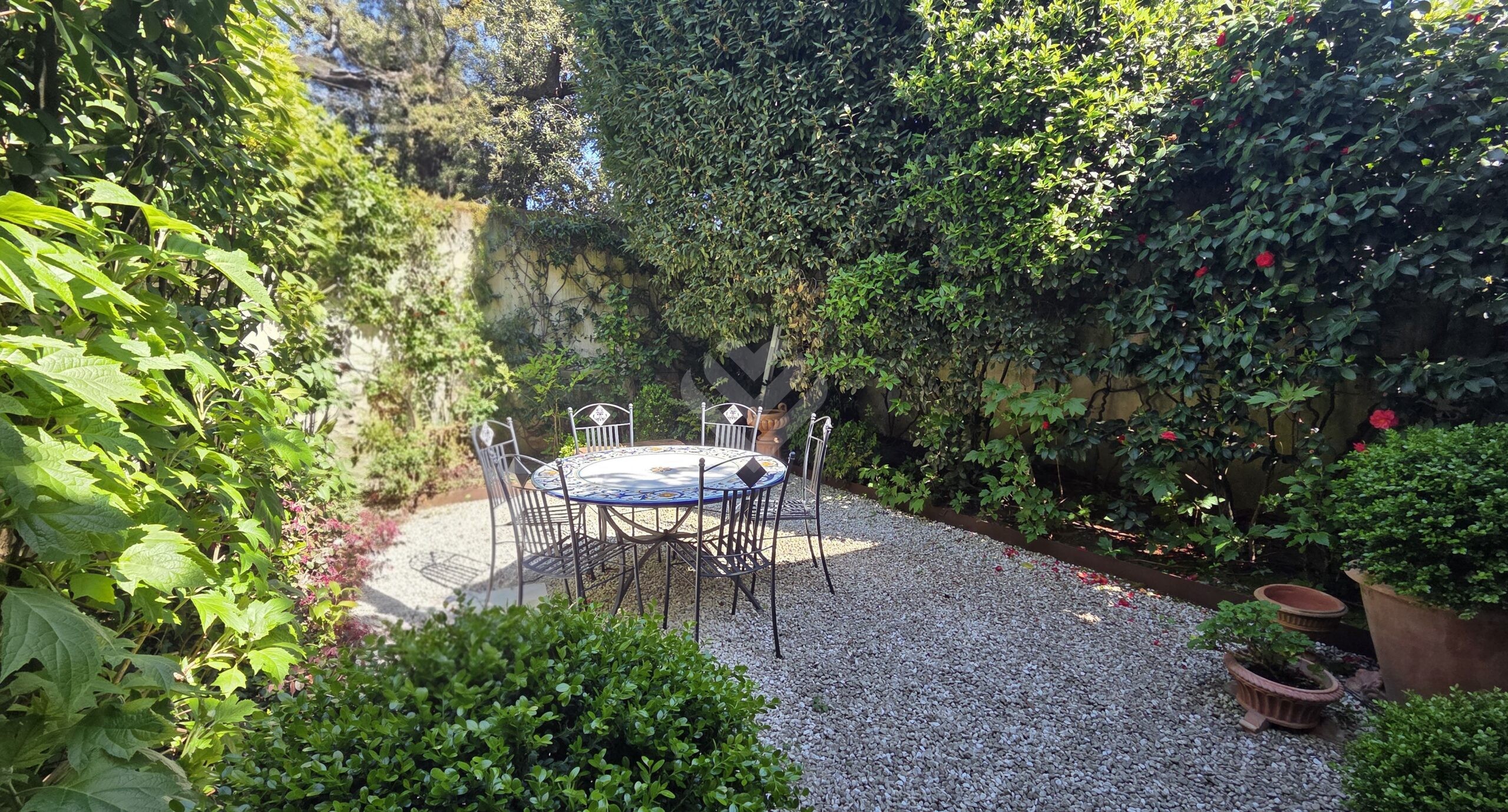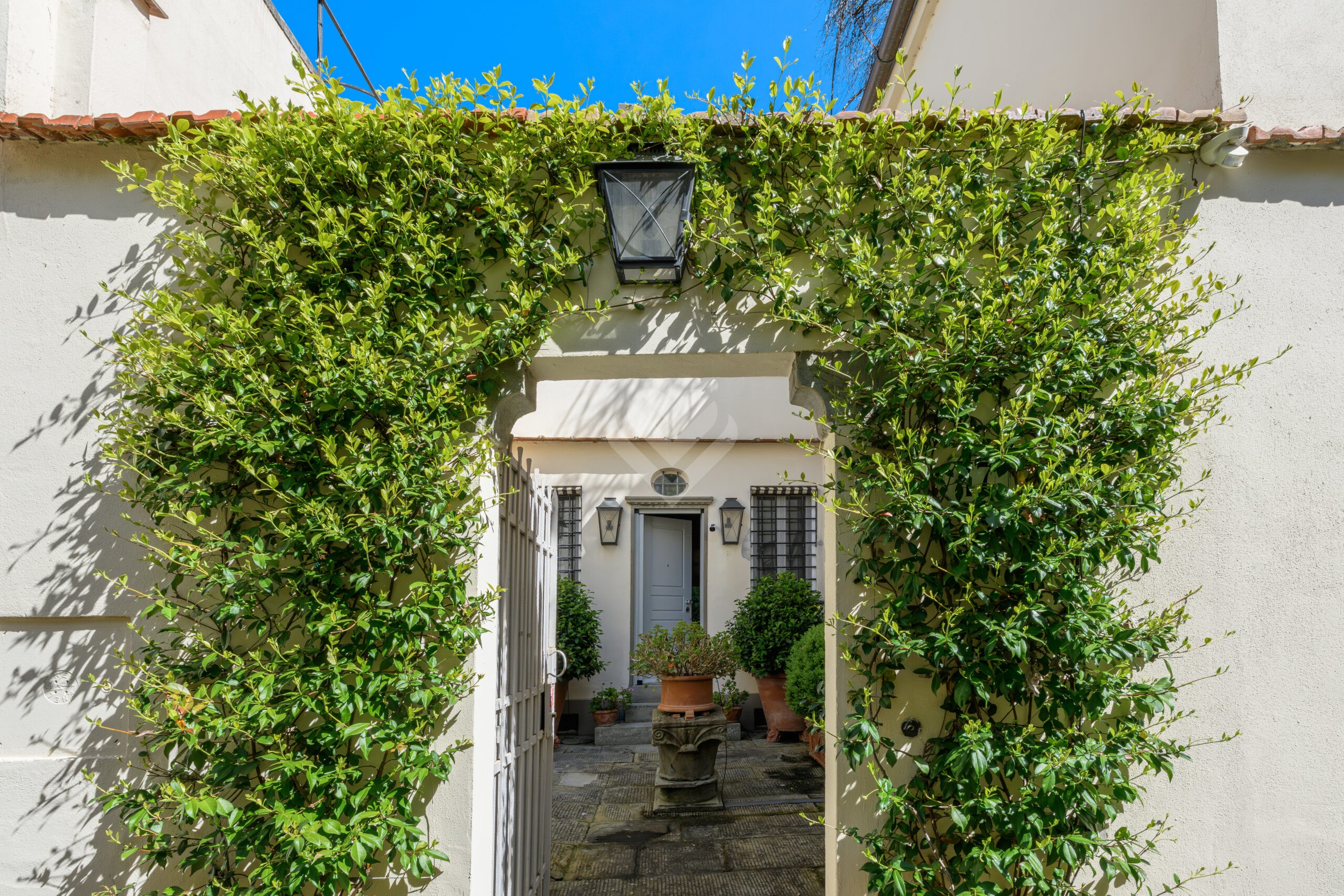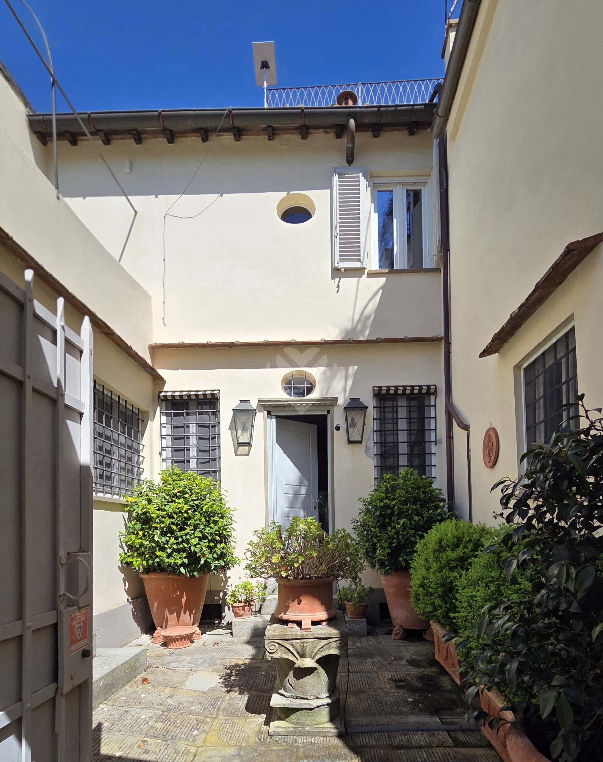 L’accesso alla proprietà avviene attraverso un incantevole vialetto pedonale privato, racchiuso tra antiche mura in pietra che introducono immediatamente a un’atmosfera di esclusività e riservatezza. Una elegante corte privata, pavimentata in pietra serena, accoglie l’ingresso del terratetto donandogli un carattere ancora più suggestivo e intimo: una vera oasi di pace nel cuore della città.