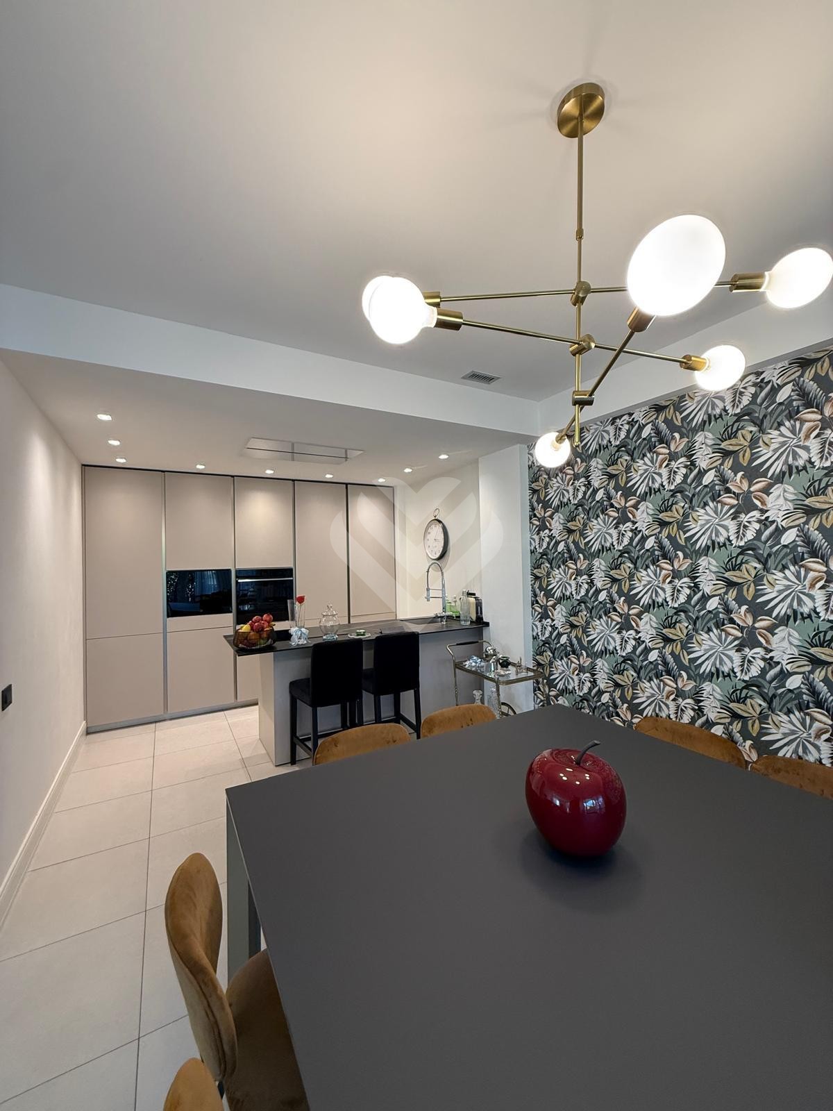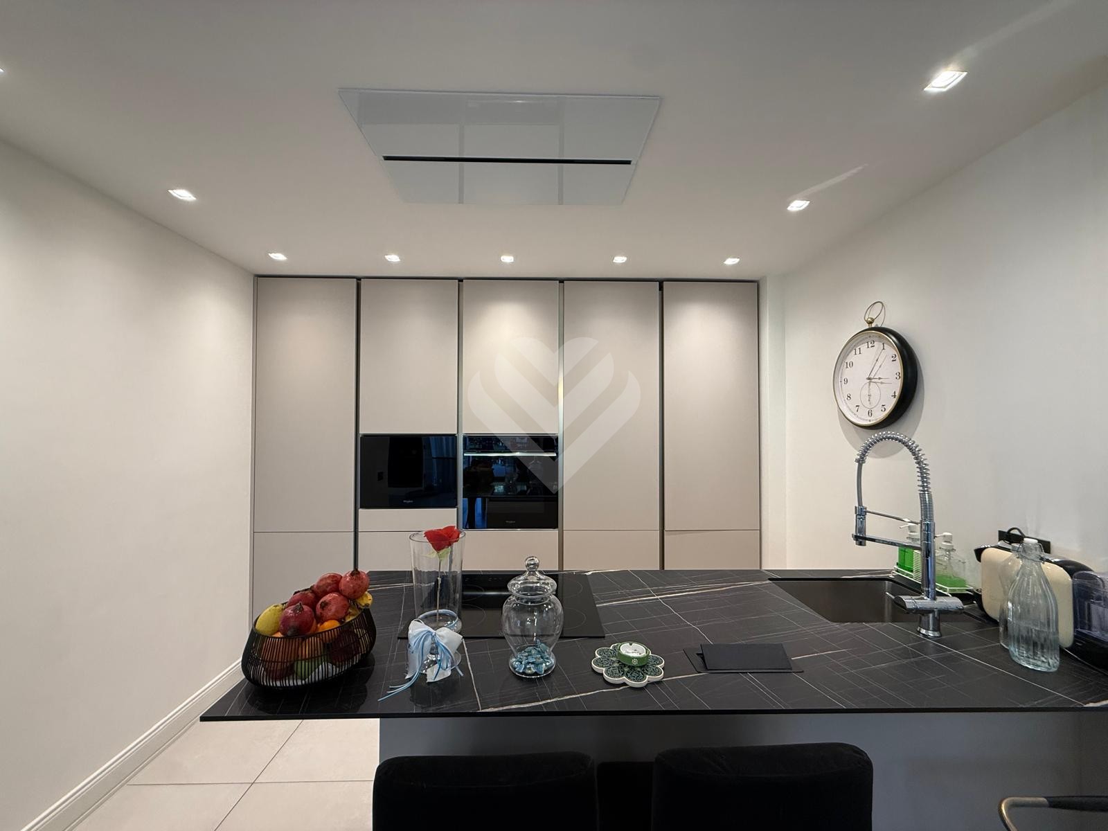 Cucina High-Tech a Vista: Lo spazio culinario, modernamente attrezzato, è impreziosito da un bancone snack funzionale che funge da cerniera tra la zona operativa e il soggiorno.